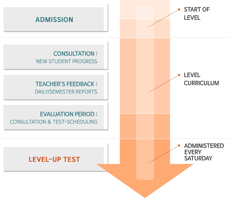 A student can progress to the next level if he/she completes the curriculum in that level, or if the teacher determines that the student has advanced to the point that he/she belongs in the next level. The student will take an official ¡°Level-Up Test,¡± after which he/she will be placed in the next level.